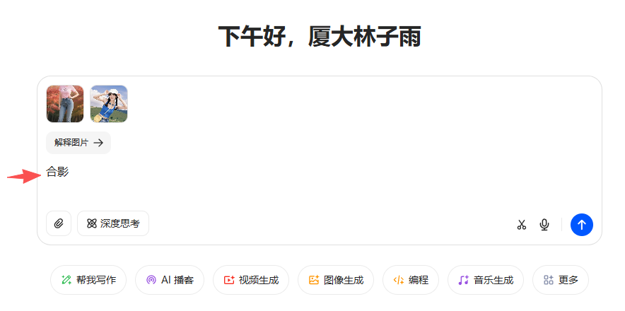 然后,如下图所示,在对话框中输入提示词“合影”,点击箭头提交按钮。