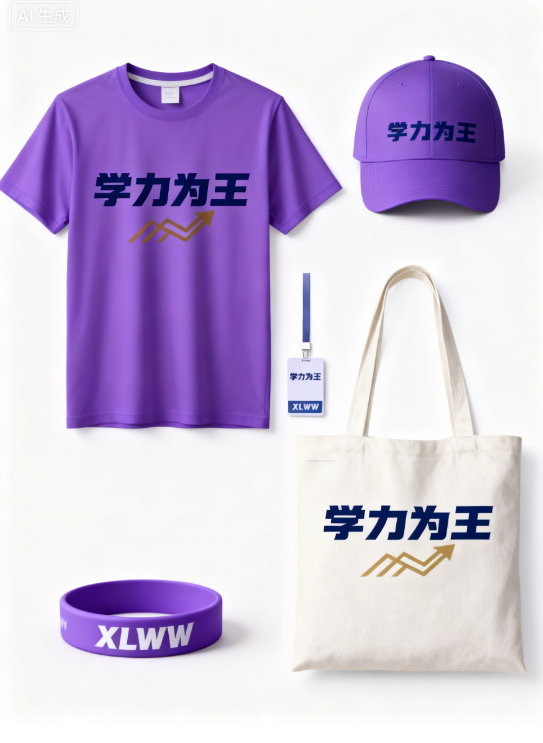 然后,在对话框中输入提示词“使用图中的logo,设计品牌名称为“XLWW”的文化衫、帽子、工牌、帆布包、手环等周边产品,紫色调为主,时尚潮流风格。”,生成的图片如下: