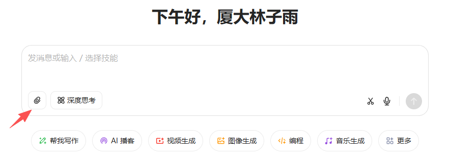 登录网页版豆包(www.doubao.com),如下图所示,点击“回形针”按钮,在豆包上传黄鹤楼图片(黄鹤楼.png)。