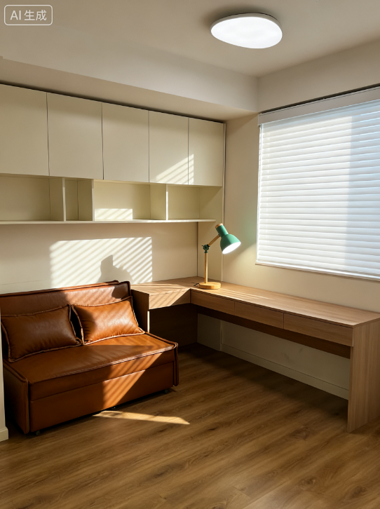 然后,在对话框中输入提示词“将图1的产品无缝合成到图2的书房场景中,注意光照和阴影的匹配”,生成的图片效果如下: