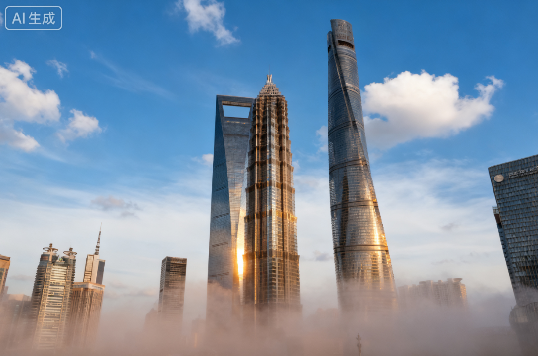 然后,在对话框中输入提示词“为这张照片添加一层平流雾,覆盖较低的楼房;同时加强阳光在建筑上的反射效果,突出东方明珠的主体地位,让画面更有层次感”,生成的图片效果如下: