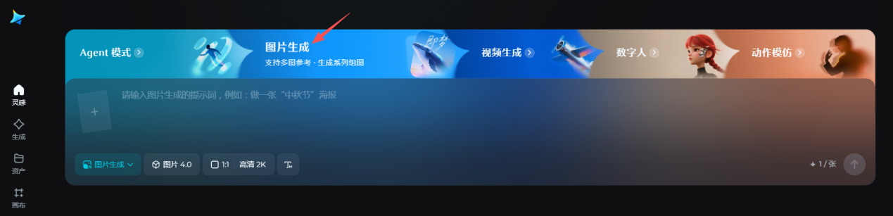 在界面中点击“图片生成”,进入生图功能。注意,注册账号后,每个账号只能获得少量的免费积分,下面的实验需要消耗很多积分,免费积分肯定不够用,所以,如果使用免费积分,只能完成下面部分实验内容。