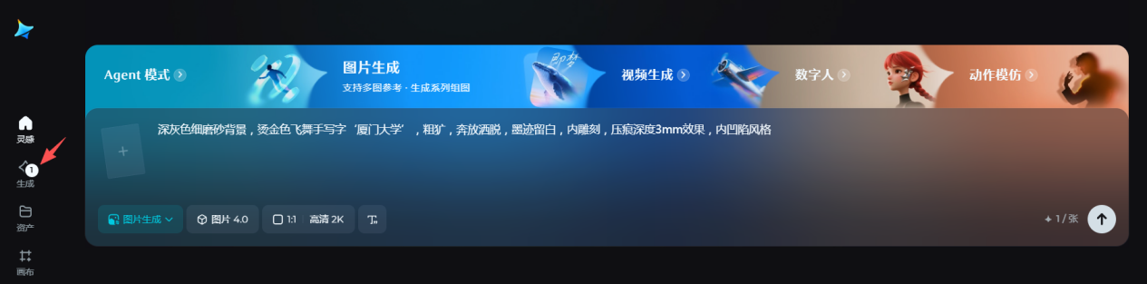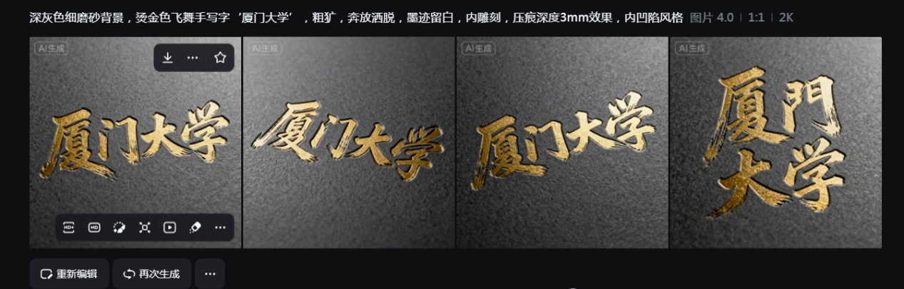 在对话框中输入提示词“深灰色细磨砂背景,烫金色飞舞手写字‘厦门大学’,粗犷,奔放洒脱,墨迹留白,内雕刻,压痕深度3mm效果,内凹陷风格”。然后,如下图所示,点击界面左侧“生成”两个字。