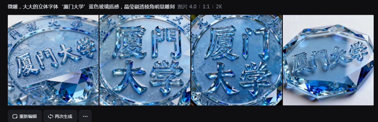 输入“微雕,大大的立体字体‘厦门大学’蓝色玻璃质感,晶莹剔透棱角明显雕刻”,即梦AI生成蓝色玻璃质感的“厦门大学”立体字体。