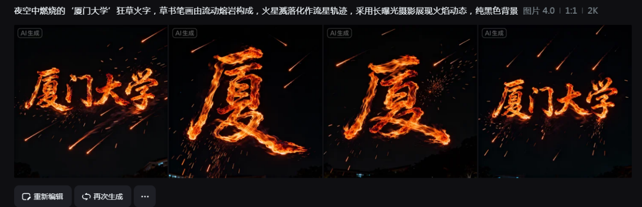 输入提示词“夜空中燃烧的‘厦门大学’狂草火字,草书笔画由流动熔岩构成,火星溅落化作流星轨迹,采用长曝光摄影展现火焰动态,纯黑色背景”,即梦AI生成夜空中燃烧的狂草火字。