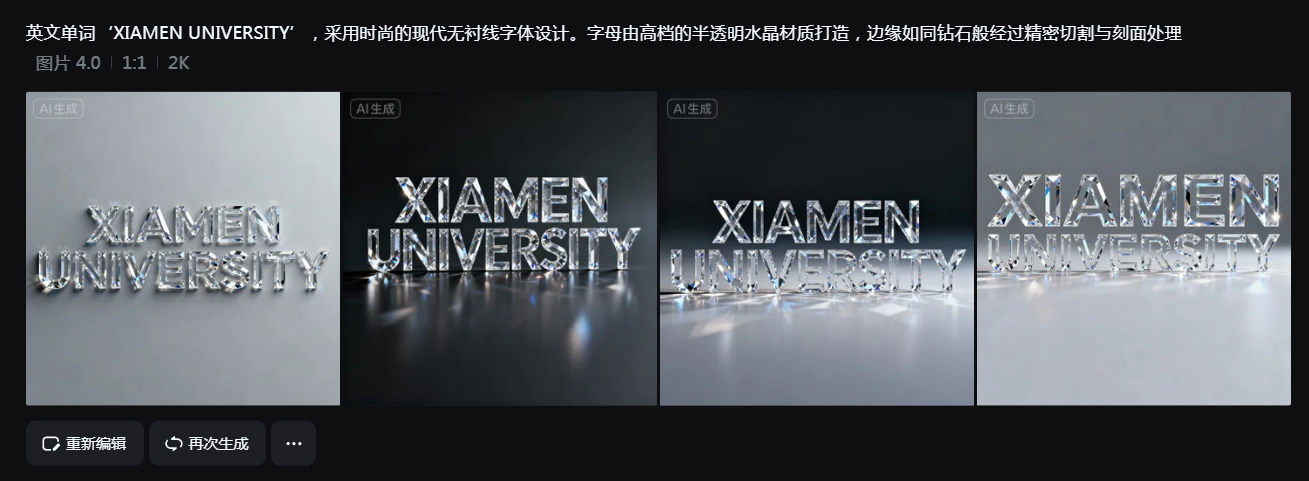 输入提示词“英文单词‘XIAMEN UNIVERSITY’,采用时尚的现代无衬线字体设计。字母由高档的半透明水晶材质打造,边缘如同钻石般经过精密切割与刻面处理”,即梦AI生成半透明水晶材质的“XIAMEN UNIVERSITY”英文单词。