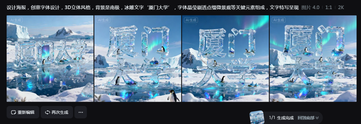 输入提示词“设计海报,创意字体设计,3D立体风格,背景是南极,冰雕文字‘厦门大学’,字体晶莹剔透点缀微景观等关键元素组成,文字特写呈现”,即梦AI生成南极背景的冰雕文字“厦门大学”海报。