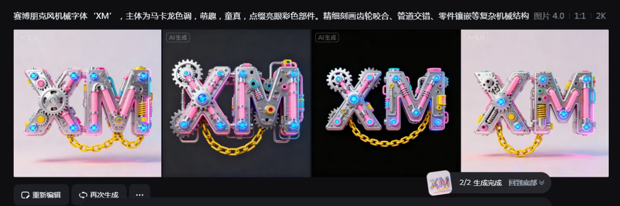 输入提示词“赛博朋克风机械字体‘XM’,主体为马卡龙色调,萌趣,童真,点缀亮眼彩色部件。精细刻画齿轮咬合、管道交错、零件镶嵌等复杂机械结构”,即梦AI生成马卡龙色调的赛博朋克风机械字体“XM”。
