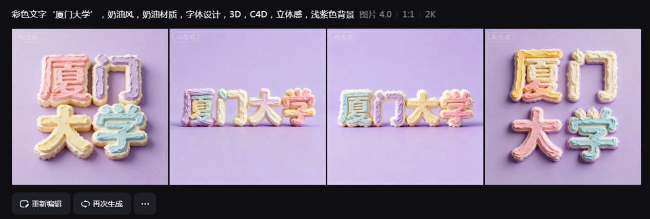 输入提示词“彩色文字‘厦门大学’,奶油风,奶油材质,字体设计,3D,C4D,立体感,浅紫色背景”,即梦AI生成奶油风的彩色文字“厦门大学”。