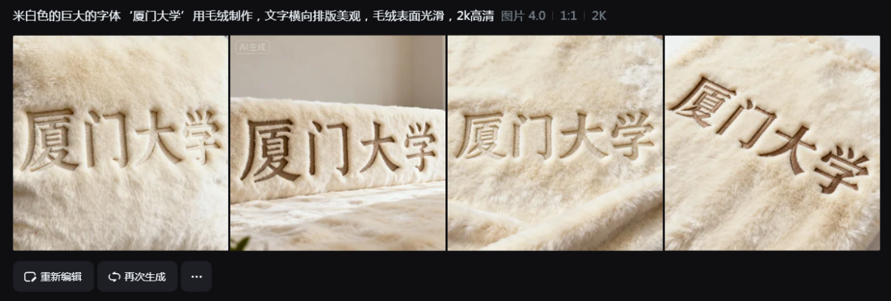 输入提示词“米白色的巨大的字体‘厦门大学’用毛绒制作,文字横向排版美观,毛绒表面光滑,2k高清”,即梦AI生成米白色的毛绒字体“厦门大学”。