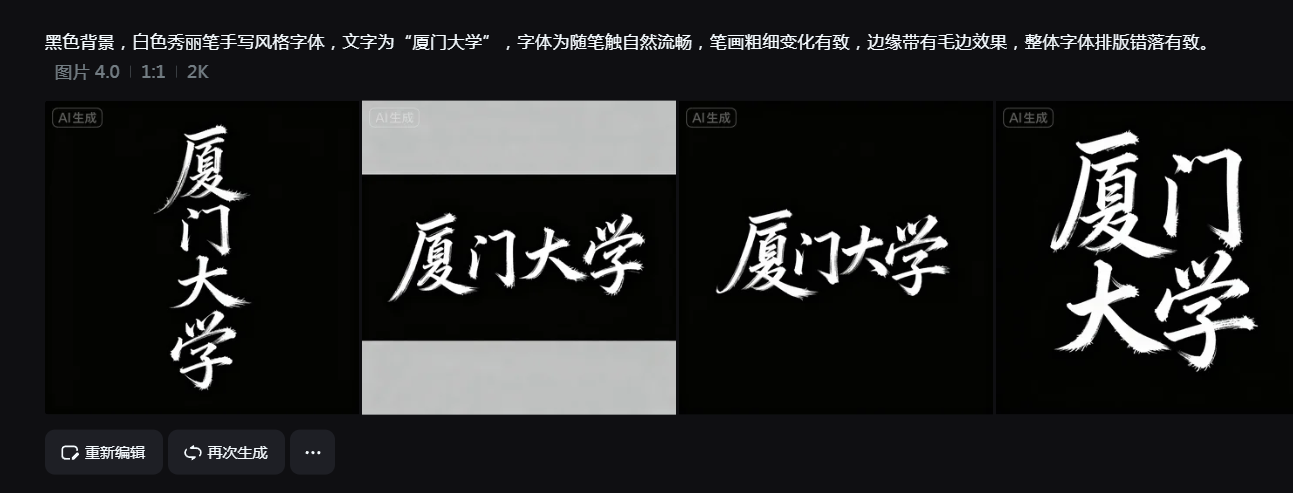 输入提示词“黑色背景,白色秀丽笔手写风格字体,文字为“厦门大学”,字体为随笔触自然流畅,笔画粗细变化有致,边缘带有毛边效果,整体字体排版错落有致。”