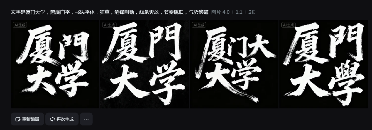 输入提示词“文字是厦门大学,黑底白字,书法字体,狂草,笔锋刚劲,线条奔放,节奏跳跃,气势磅礴。”