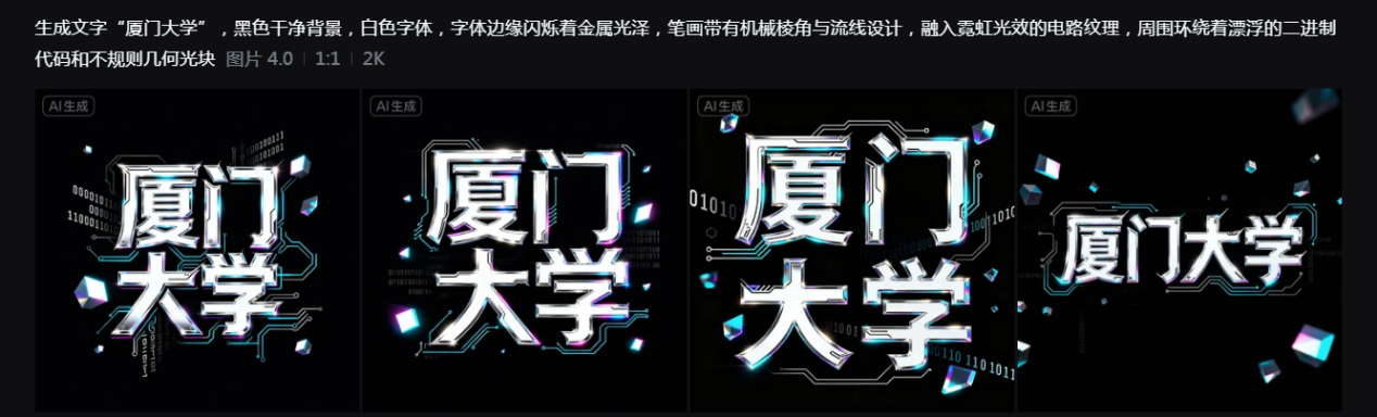 输入提示词“文字是厦门大学,黑色干净背景,白色字体,字体边缘闪烁着金属光泽,笔画带有机械棱角与流线设计,融入霓虹光效的电路纹理,周围环绕着漂浮的二进制代码和不规则几何光块。”