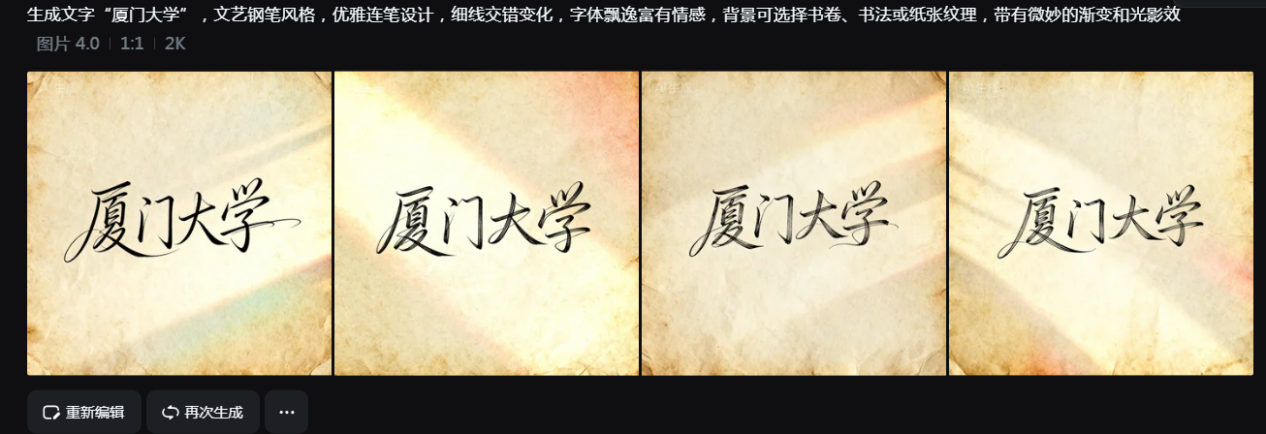 输入提示词“生成文字“厦门大学”,文艺钢笔风格,优雅连笔设计,细线交错变化,字体飘逸富有情感,背景可选择书卷、书法或纸张纹理,带有微妙的渐变和光影效果”。