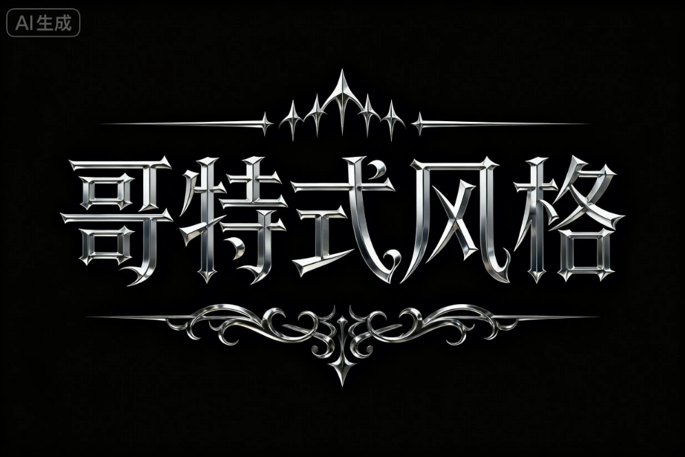 输入提示词“生成文字“哥特式风格”,黑色背景,字体棱角分明,饰以精致衬线和独特弯折装饰,呈现出神秘而复古的氛围。”