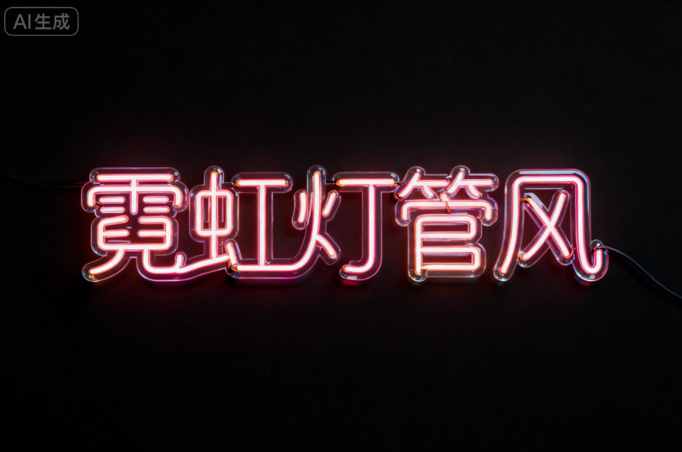 输入提示词“生成文字“霓虹灯管风”,字体为发光描边,线条细长柔和,弯曲流畅,具有玻璃感内发光效果,背景为黑色,营造出霓虹灯管的效果。”