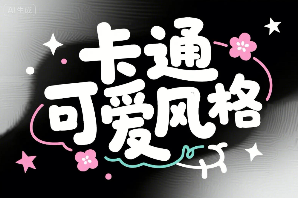 输入提示词“输入文字“卡通可爱风格”,黑色背景,白色胖乎乎的可爱卡通风格字体,笔画交错,充满童趣与少女心氛围。”