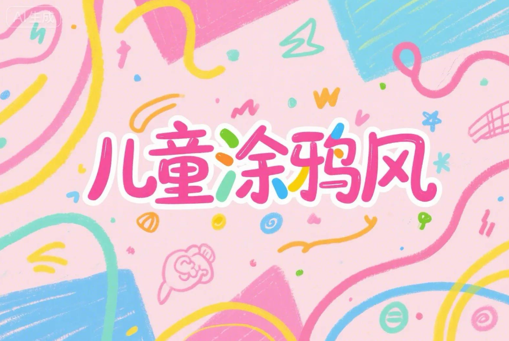 输入提示词“生成文字“儿童涂鸦风”,彩色背景,字体笔画随意,带有彩色的涂鸦线条和图案,充满童真和创意。”