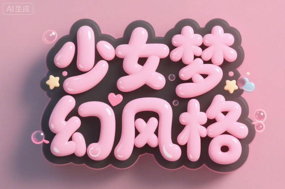 生成文字“生成文字“少女梦幻风格”,粉色调背景,字体为粉色系,笔画圆润软萌,具有泡泡感和糖果质感,字形偏矮,常点缀小星星或爱心尾巴。”