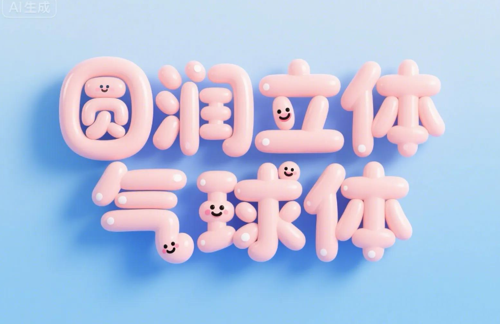 输入提示词“生成文字“圆润立体气球体”,淡蓝渐变背景,所有笔画圆润化,字母呈膨胀气球状,端点点缀高光圆弧,部分字母内嵌小表情符号,充满童趣。”