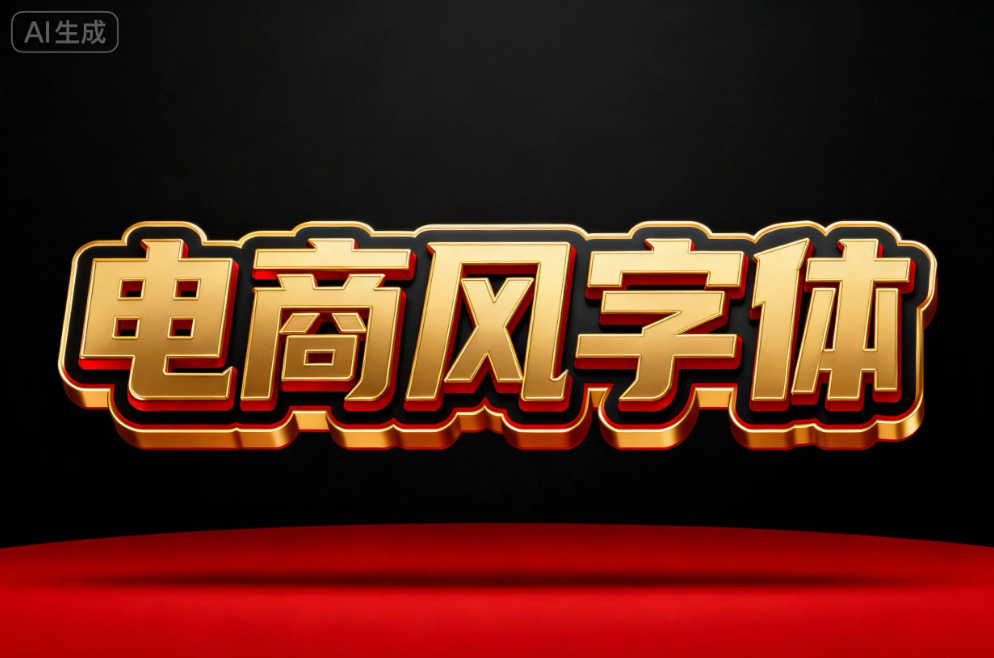 输入提示词“生成文字“电商风字体”,深黑背景搭配3D立体金色字体,鎏金镶边,字体呈现三层递进立体效果,中间层为哑光质感凸起描边,底部为红色衬底,具有强烈的促销氛围。”