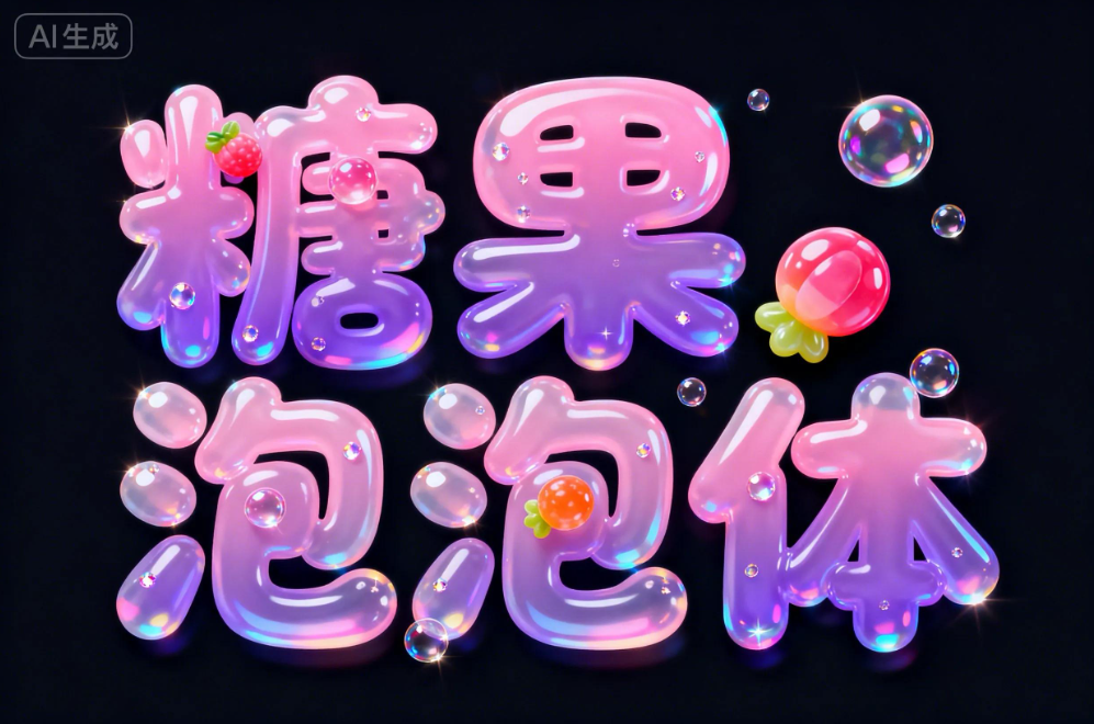 输入提示词“生成文字“糖果泡泡体”,渐变粉紫配深黑背景,笔画呈现充气膨胀质感,表面点缀晶莹光斑折射效果,字母轮廓笼罩半透光晕,随机气泡内嵌立体水果糖装饰,甜美可爱。”