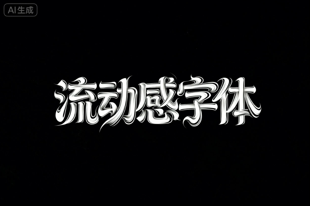 输入文字“生成文字“流动感字体”,黑色背景,字体扭曲且重叠,动态不规则的字体流动,创意的笔画扭曲和融合,现代抽象风格,粗细线条交替,既具可读性又富艺术感。”