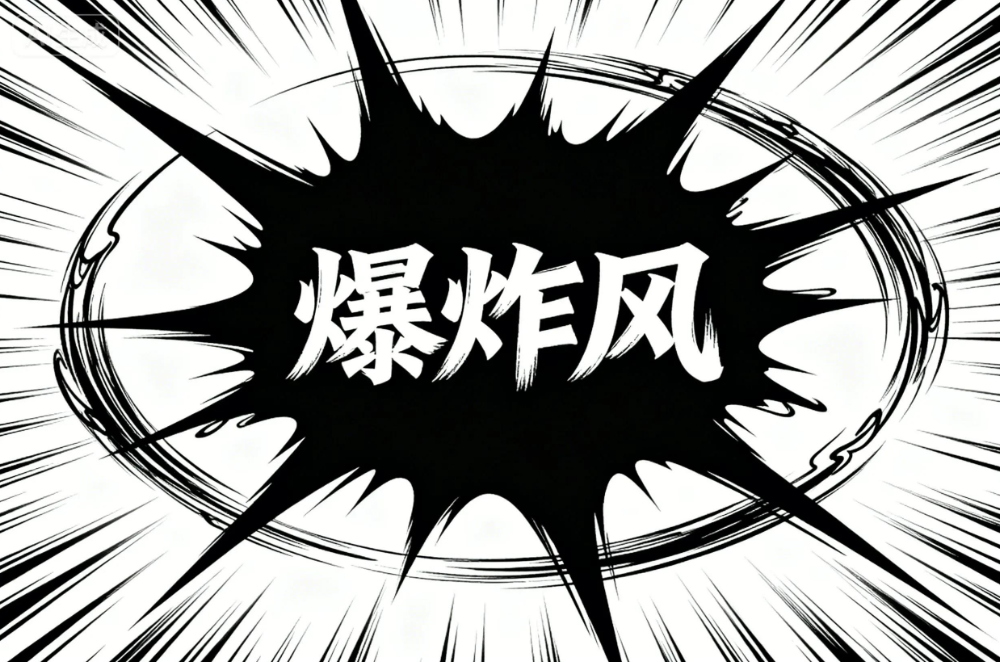 输入提示词“生成文字“爆炸风”,黑色背景,动态爆炸风,弧形延展,笔画爆发状延伸,线条扭曲中带张力,漫画拟声字,充满活力和动感。”