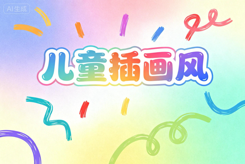 输入提示词“生成文字“儿童插画风”,彩色背景,手绘风格,线条跳跃,不规则笔画,圆润边角,彩色渐变笔触,充满趣味童真。”
