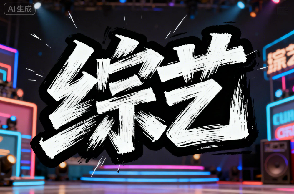 输入提示词“生成文字“综艺手写体”,马克笔手写,粗犷的笔画,飞白效果,黑底白字,富有个性和活力,适合用于综艺节目相关的设计。”