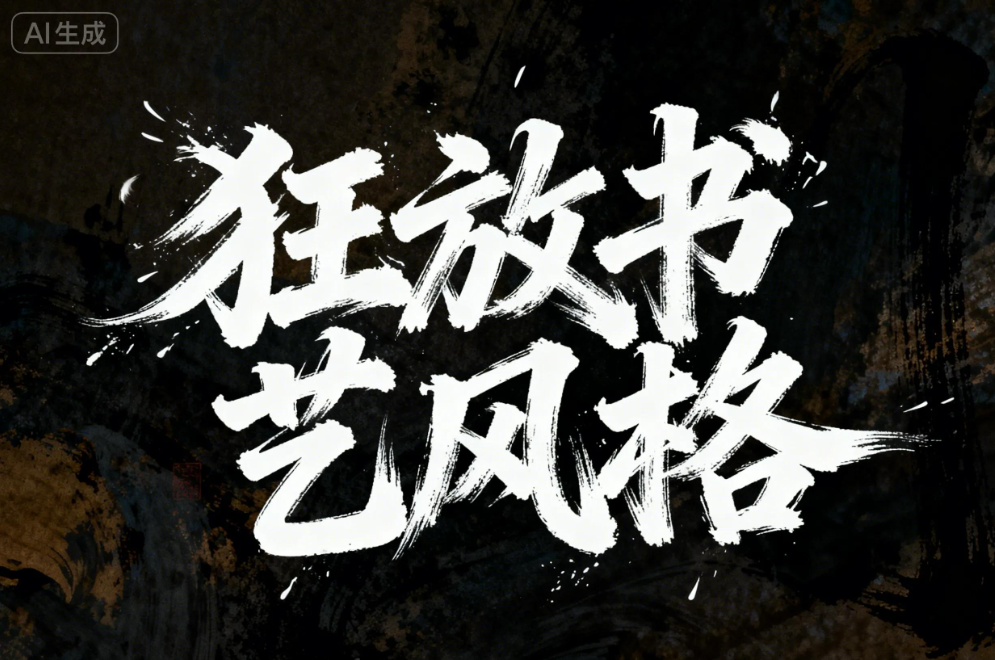输入提示词“生成文字“狂放书艺风格”,草书奔放字形,飞白技法应用,笔触刚劲有力且富有节奏感,背景暗色调,字形自由流动,极具表现力和情感张力”。