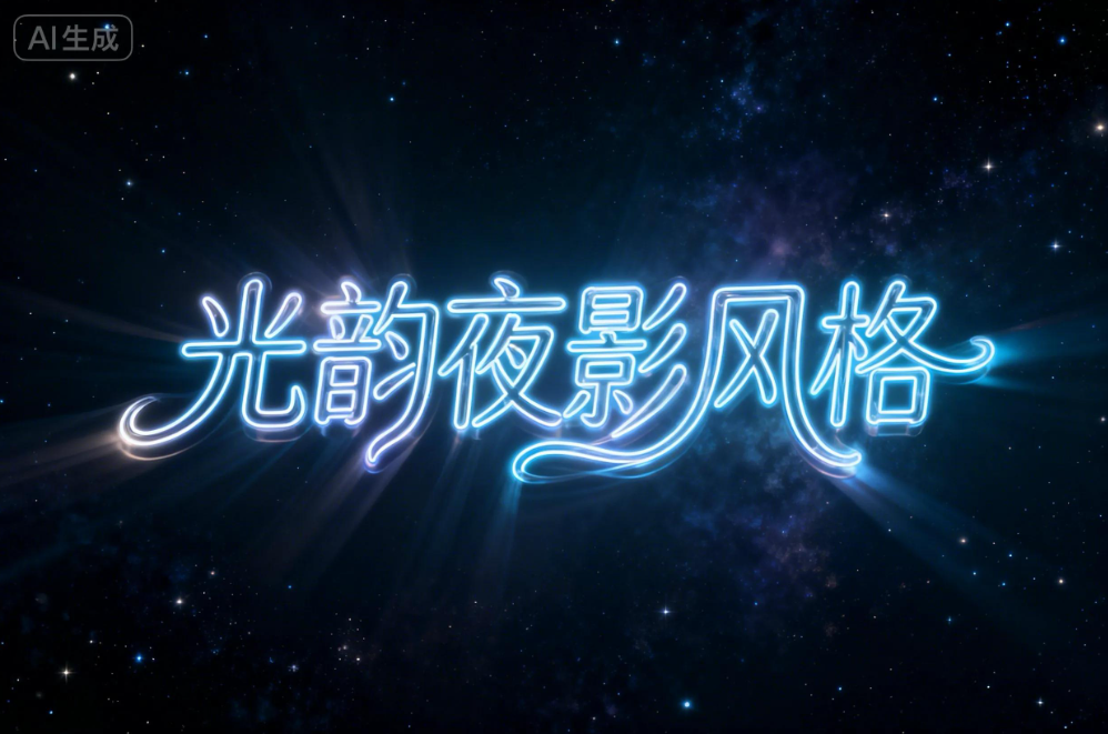 输入提示词“生成文字“光韵夜影风格”,轮廓式霓虹勾勒,线条飘逸纤细,背景为深邃的星空或光晕效果,光线与暗影交织,呈现透明质感与内部发光效果,字形富有动感和延展性,排版上自由流畅”。