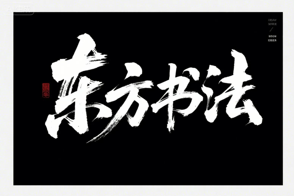输入提示词“生成文字“东方书法风”,黑底白字,书法字体,笔锋刚劲,线条奔放,节奏跳跃,气势磅礴。”
