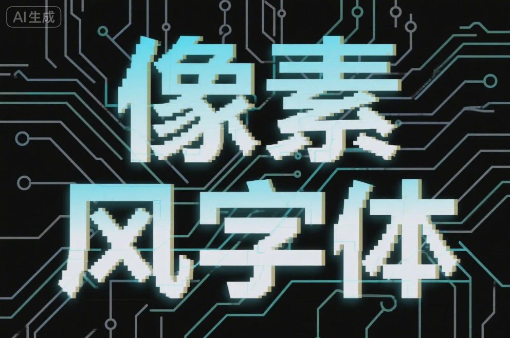输入提示词“生成文字“像素风字体”,深黑背景渐变色文字,双重位移重影叠加于笔画边缘,部分字符像素化解构,线条交织成电路板式网格,充满复古的科技感。”
