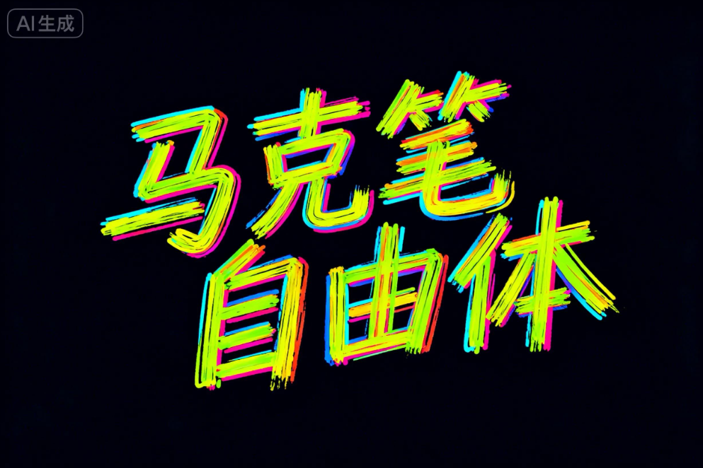 输入提示词“生成文字“马克笔自由体”,深黑背景,荧光多彩字,马克笔风格随意书写,笔触边缘略显粗糙,部分笔画粗细不一,充满即兴创作感。”