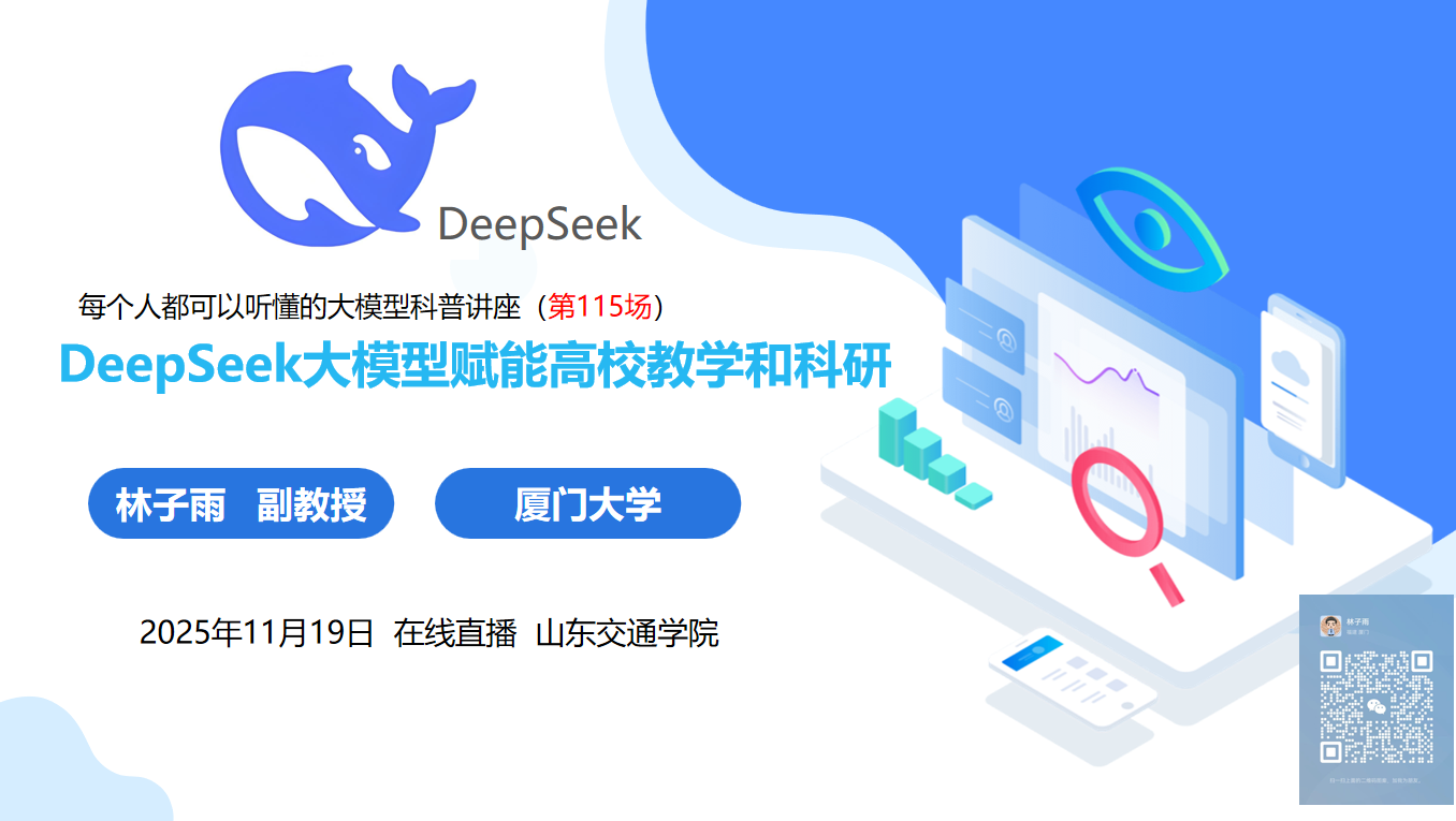 林子雨老师应邀为山东交通学院做大模型讲座 林子雨 2025-11-19 25 2025年11月19日下午,林子雨老师通过在线腾讯会议直播形式,应邀为山东交通学院国际商学院教师做大模型讲座。(下载厦大团队大模型系列科普报告和讲课视频)