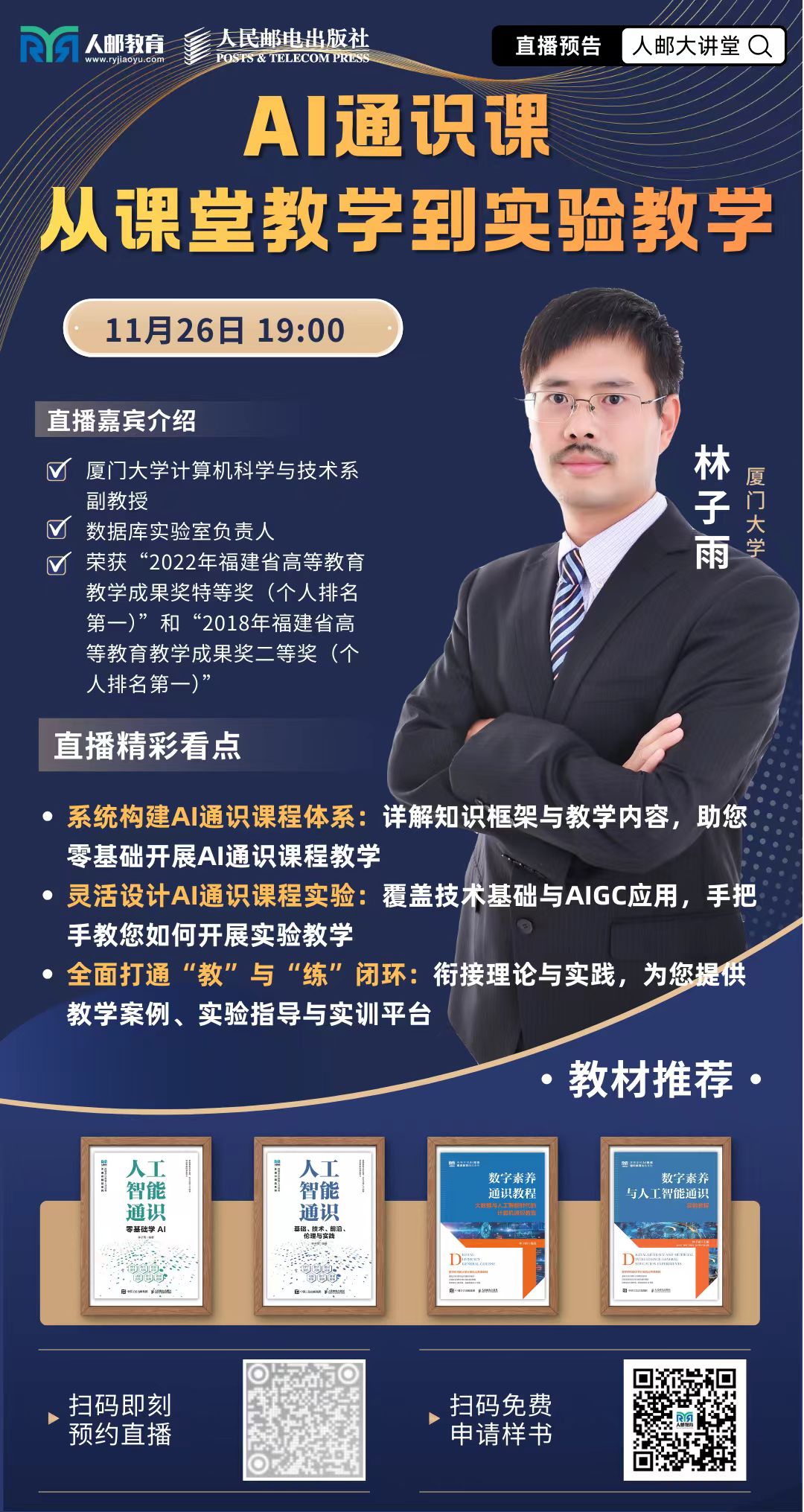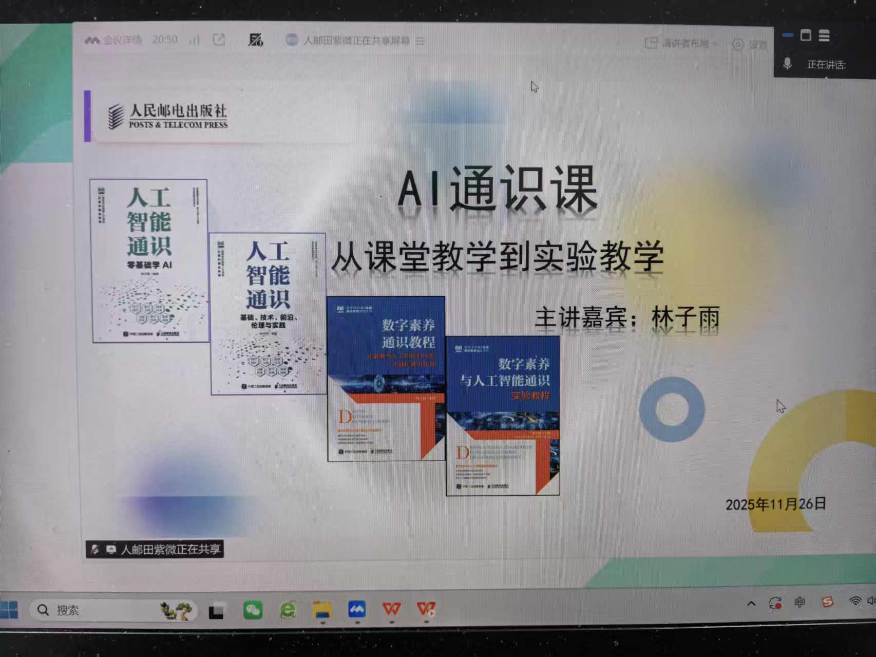 林子雨老师直播分享人工智能通识课建设经验 林子雨 2025-11-26 2 2025年11月26日晚上,林子雨老师应人民邮电出版社邀请,为全国高校教师做直播,系统介绍人工智能通识课建设经验和即将出版的两本人工智能通识课教材。