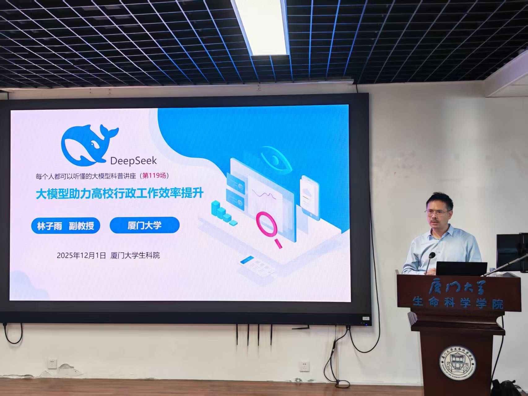 林子雨老师应邀为厦门大学生命科学学院师生做大模型讲座 林子雨 2025-12-01 2 2025年12月1日,林子雨老师应邀为厦门大学生命科学学院师生做大模型科普讲座,受到好评。厦门大学生命科学学院马进龙书记等100余位师生参加了讲座。(下载厦大团队大模型系列科普报告和讲课视频)
