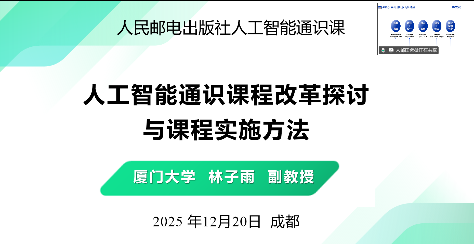 林子雨老师应邀为成都人工智能通识课研讨会做报告 林子雨 2025-12-20 1 2025年12月20日上午,由人民邮电出版社主办的高校人工智能通识课建设研讨会在成都举办,林子雨老师通过在线直播方式,为会议做了题为《高校人工智能通识课改革探讨与教材建设经验分享》的报告。