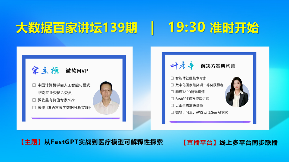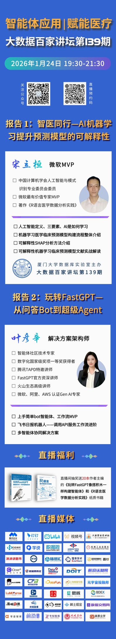 2026年1月24日(周六)晚上7点30分到10点,实验室举办了第139期大数据百家讲坛,微软MVP宋立桓做了题为《智医同行——AI机器学习提升预测模型的可解释性》的报告,智能体社区技术专家叶彦辛做了题为《玩转FastGPT——从问答Bot到超级Agent》的专题报告。20300余人在线收听了报告,并对报告给予高度评价。