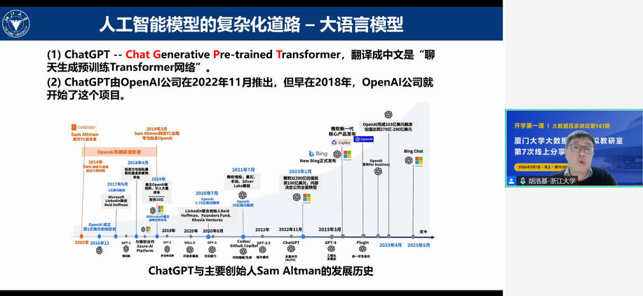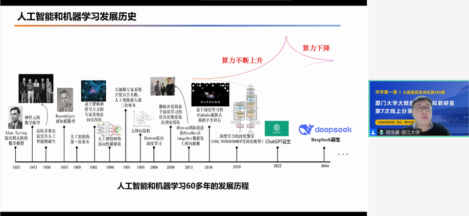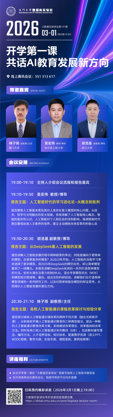 实验室举办大数据百家讲坛第141期 林子雨 2026-03-01 1 【观看大数据百家讲坛所有往期视频】 2026年3月1日(周日)晚上7点到10点,实验室举办了第141期大数据百家讲坛,哈尔滨工程大学莫宏伟教授、浙江大学胡浩基副教授、厦门大学林子雨副教授做了人工智能专题报告。34000余人在线收听了报告,并对报告给予高度评价。