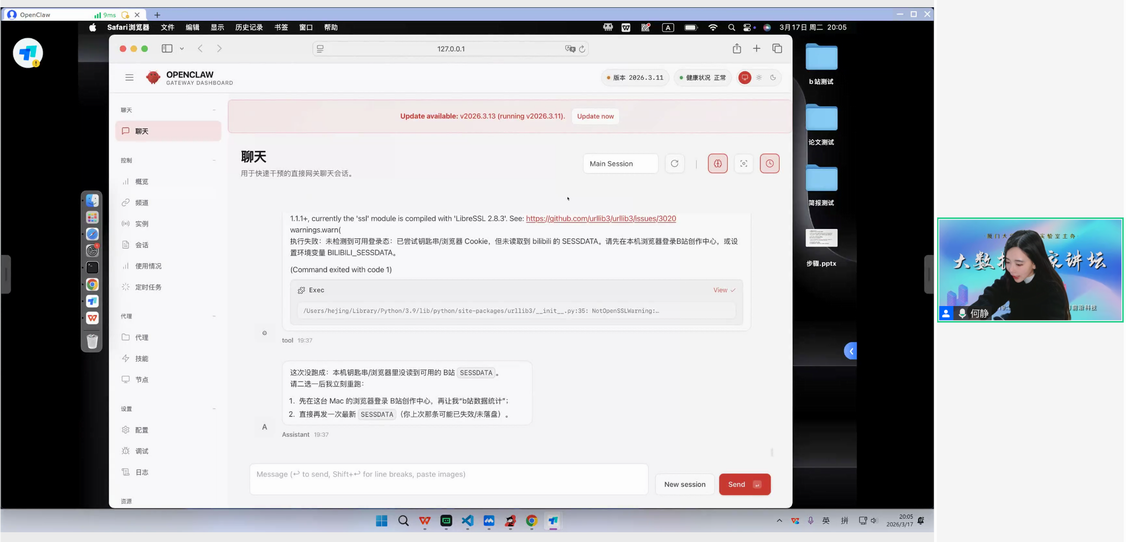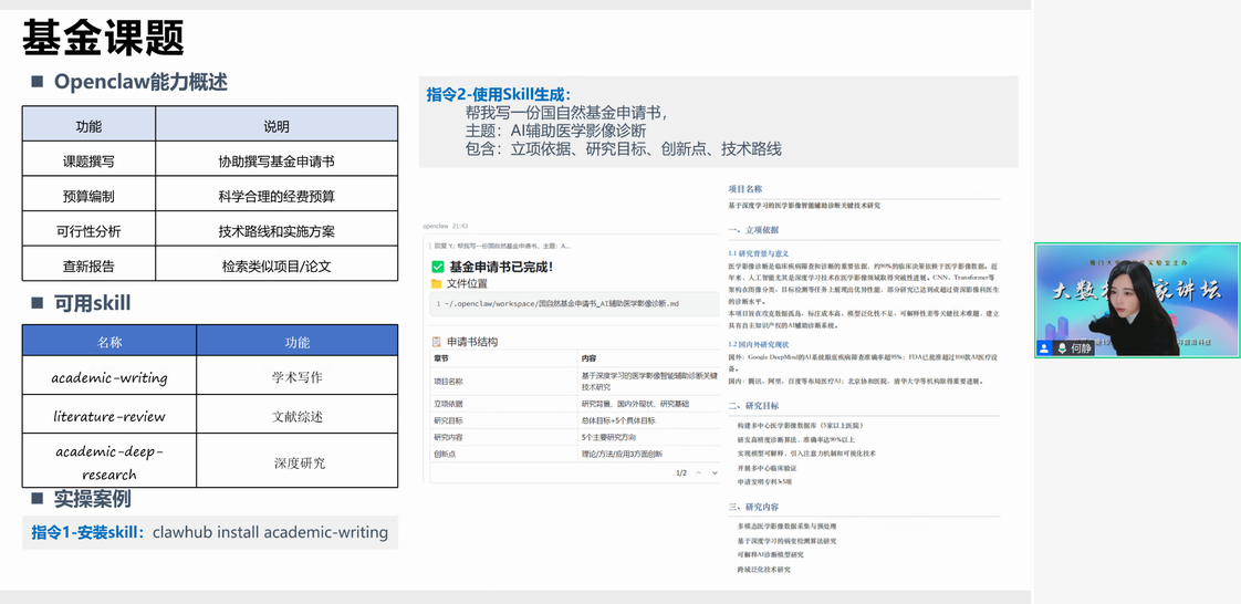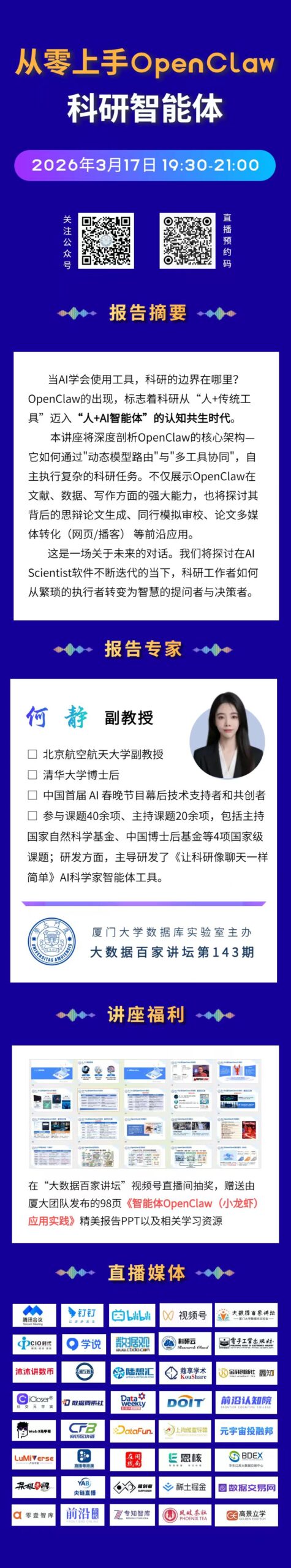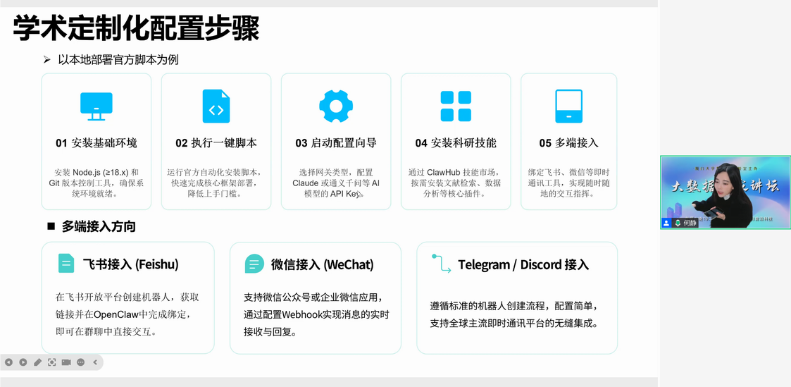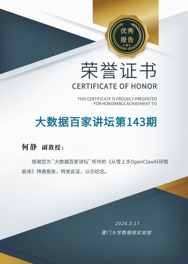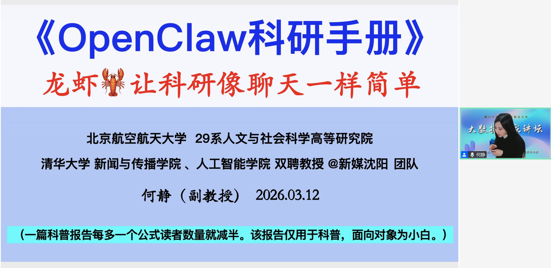 实验室举办大数据百家讲坛第143期 林子雨 2026-03-17 4 【观看大数据百家讲坛所有往期视频】 2026年3月17日(周二)晚上7点半到9点,实验室举办了第143期大数据百家讲坛,北京航空航天大学何静副教授做了题为《从零上手OpenClaw科研智能体》的报告。42000余人在线收听了报告,并对报告给予高度评价。