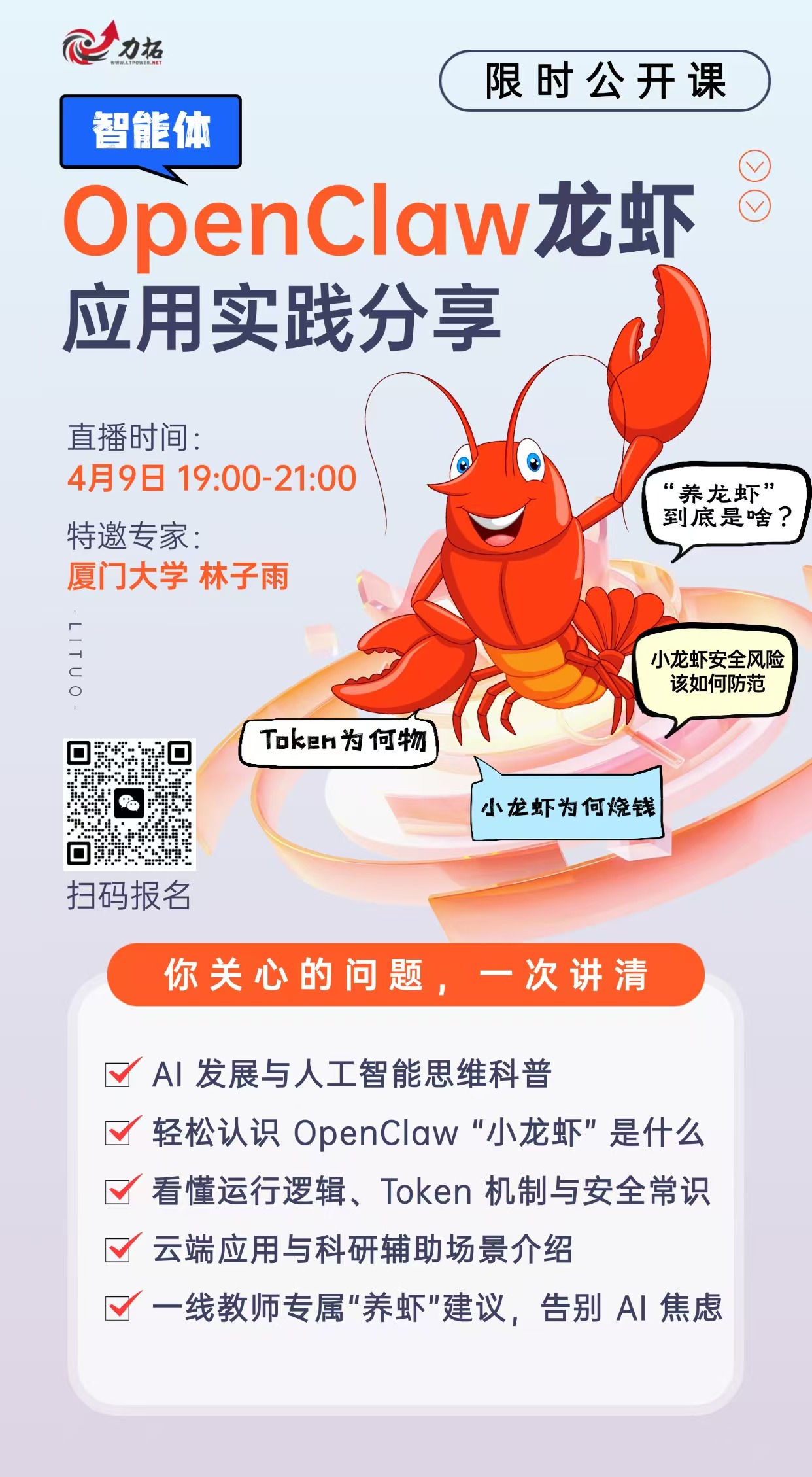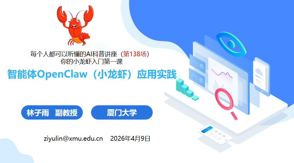 林子雨老师为高校教师做小龙虾直播讲座 林子雨 2026-04-09 3 2026年4月9日晚,应广东力拓科技公司邀请,林子雨老师为高校教师做小龙虾直播讲座,系统介绍OpenClaw的核心架构、安装部署方法和如何辅助科研。