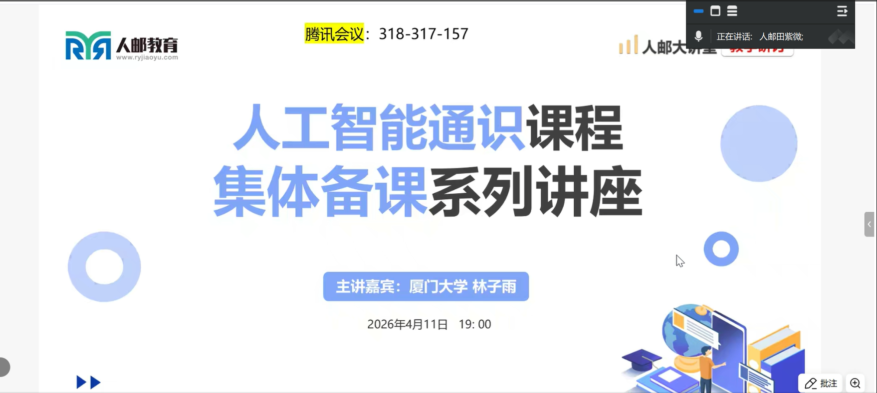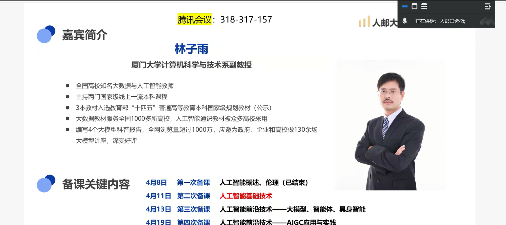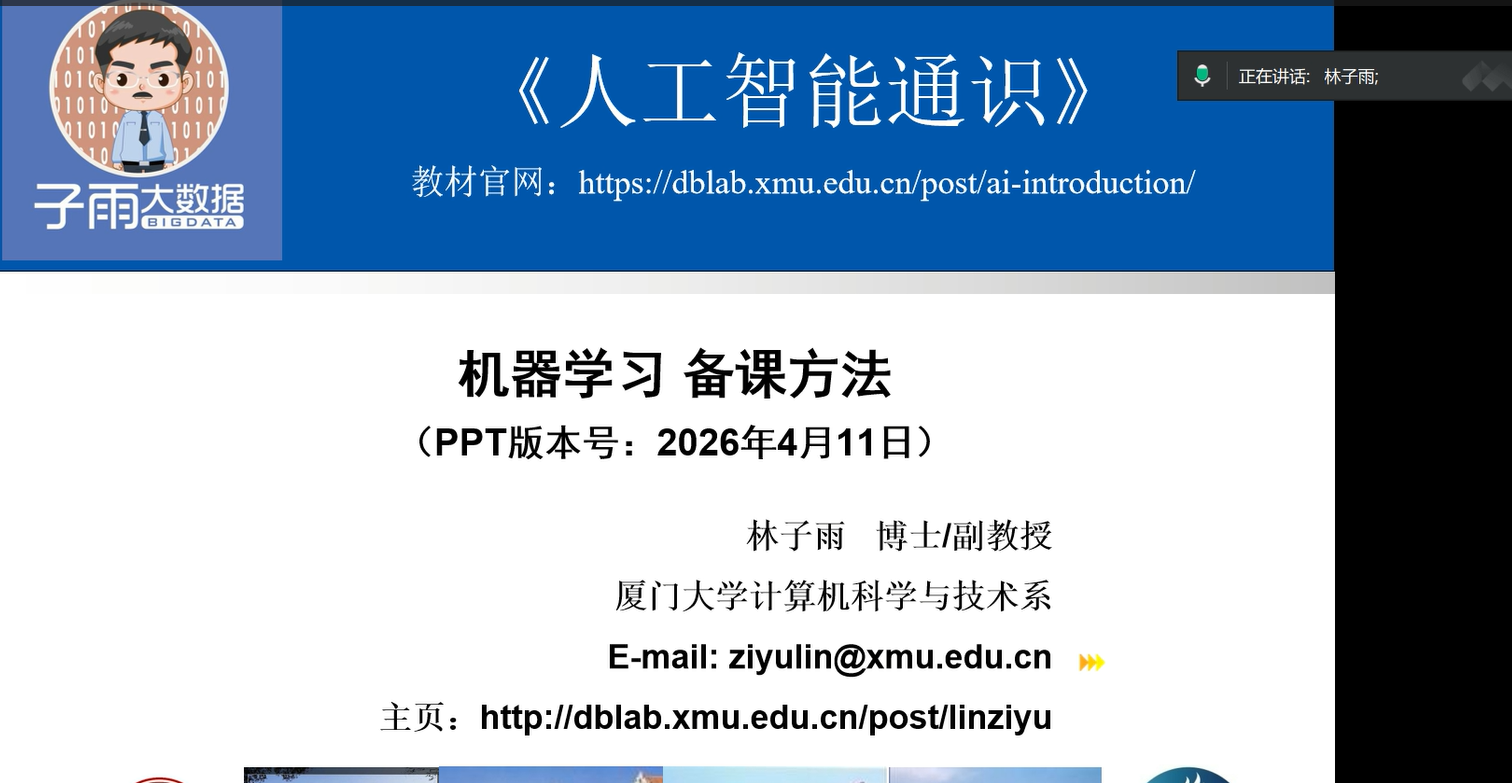 2026年4月11日晚,人民邮电出版社举办了人工智能通识课第2次备课活动,本次活动通过腾讯会议在线直播,200多位高校教师参加了备课活动,林子雨老师详细介绍了机器学习、自然语言处理和计算机视觉的备课方法,并在互动交流环节回答了老师们的问题。(观看回放视频)