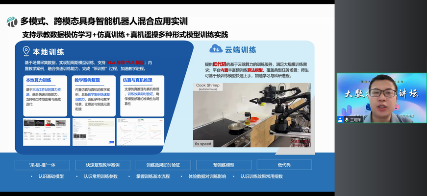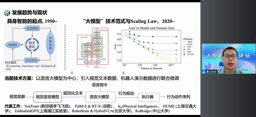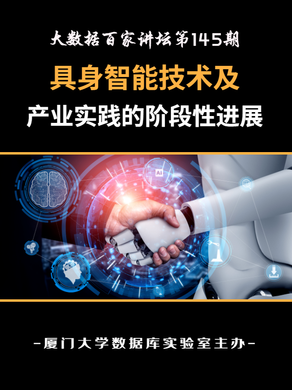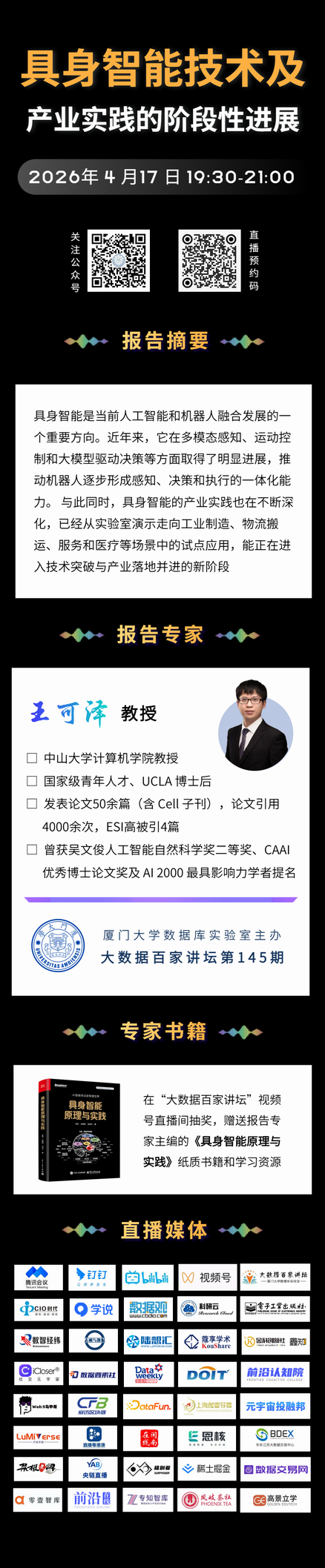 实验室举办大数据百家讲坛第145期 林子雨 2026-04-17 3 【观看大数据百家讲坛所有往期视频】 2026年4月17日晚上7点半到9点半,实验室举办了第145期大数据百家讲坛,中山大学计算机学院王可泽教授做了题为《具身智能技术及其产业实践的阶段性进展》的报告。20000余人在线收听了报告,并对报告给予高度评价。