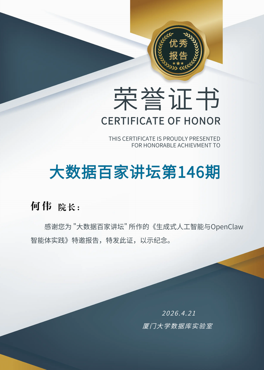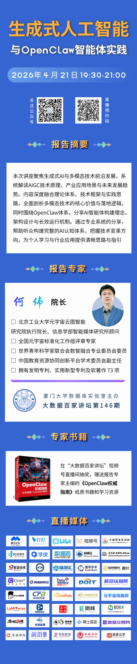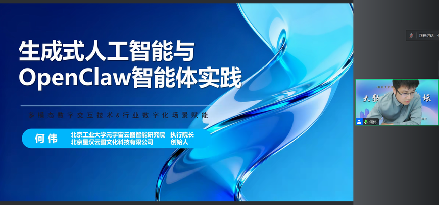 2026年4月21日晚上7点半到9点半,实验室举办了第146期大数据百家讲坛,北京工业大学元宇宙云图智能研究院执行院长何伟院长做了题为《生成式人工智能与OpenClaw智能体实践》的报告。23000余人在线收听了报告,并对报告给予高度评价。