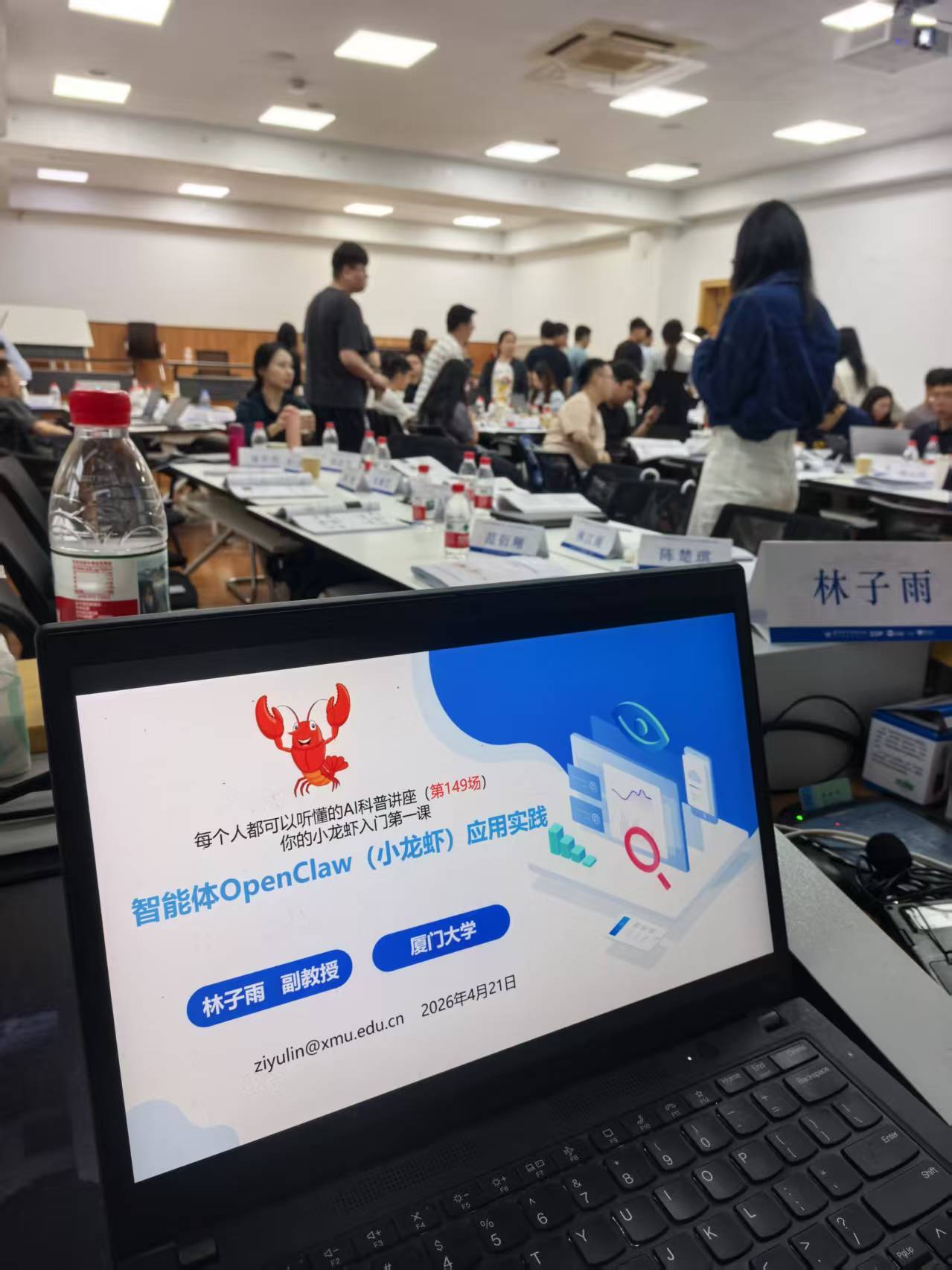 林子雨老师应邀为国家电网福建省公司青年骨干做小龙虾科普讲座 林子雨 2026-04-21 2 2026年4月21日下午,林子雨老师应厦门大学管理学院邀请,为国家电网福建省公司青年骨干做主题为《智能体OpenClaw(小龙虾)应用实践》的专题报告,获得好评。(观看讲座视频)