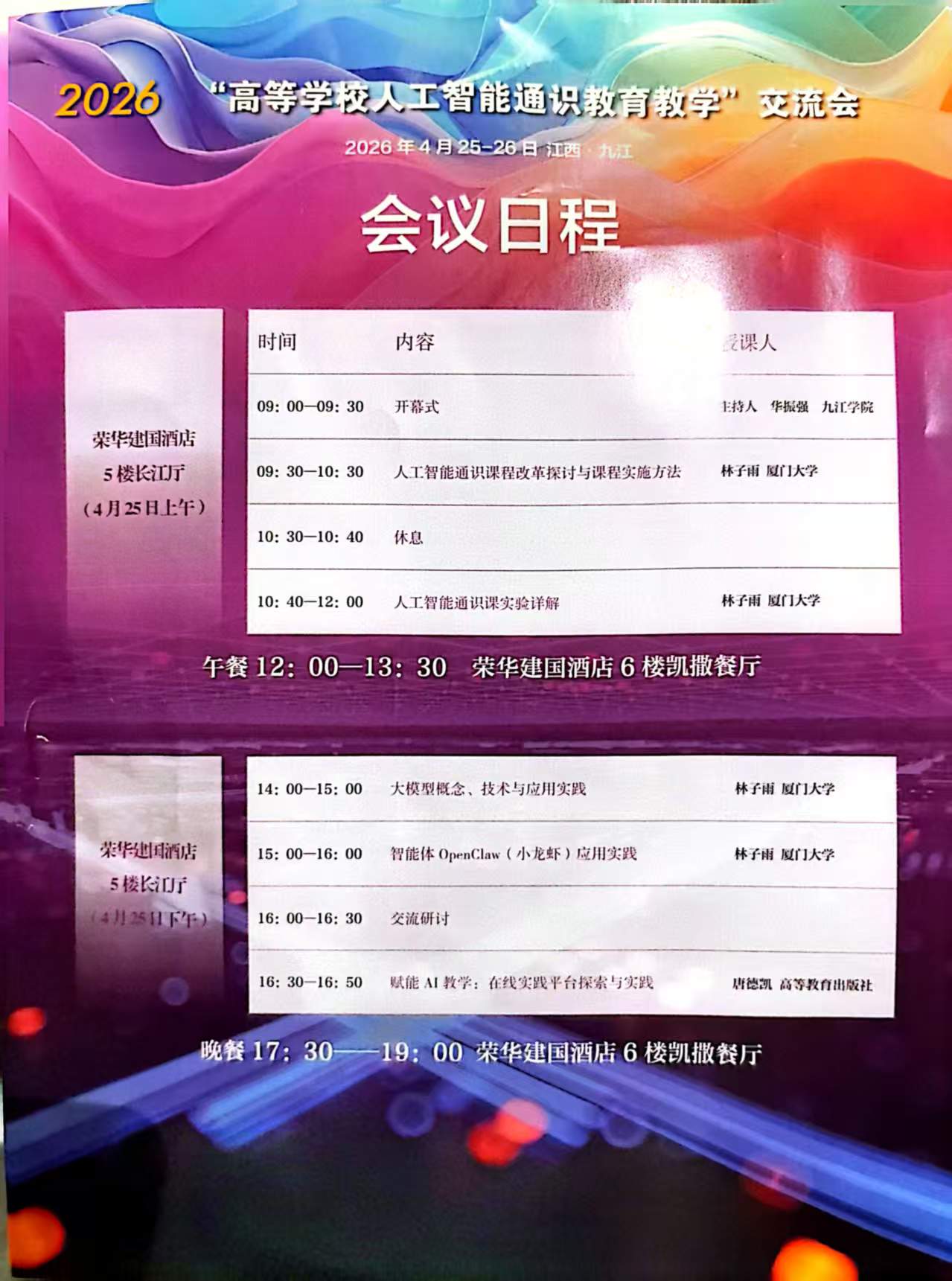 2026年4月25日,由高等教育出版社主办的“2026高校人工智能通识教育教学交流会”,在江西省九江市举行,林子雨老师作为特邀报告嘉宾,为本次交流会做了4个主题报告,包括《高校人工智能通识课改革方案探讨和课程实施方法》《人工智能通识实验课详解》《大模型概念、技术与应用实践》《智能体OpenClaw(小龙虾)应用实践》,获得参会150多位教师的好评。