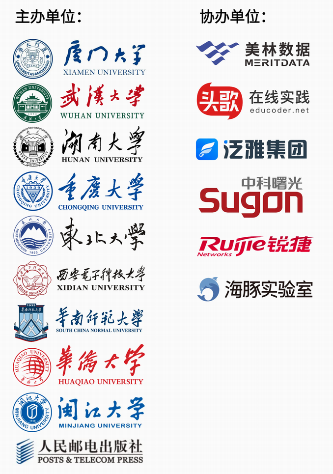 主办单位:厦门大学、武汉大学、湖南大学、重庆大学、东北大学、西安电子科技大学、华南师范大学、华侨大学、闽江大学、人民邮电出版社