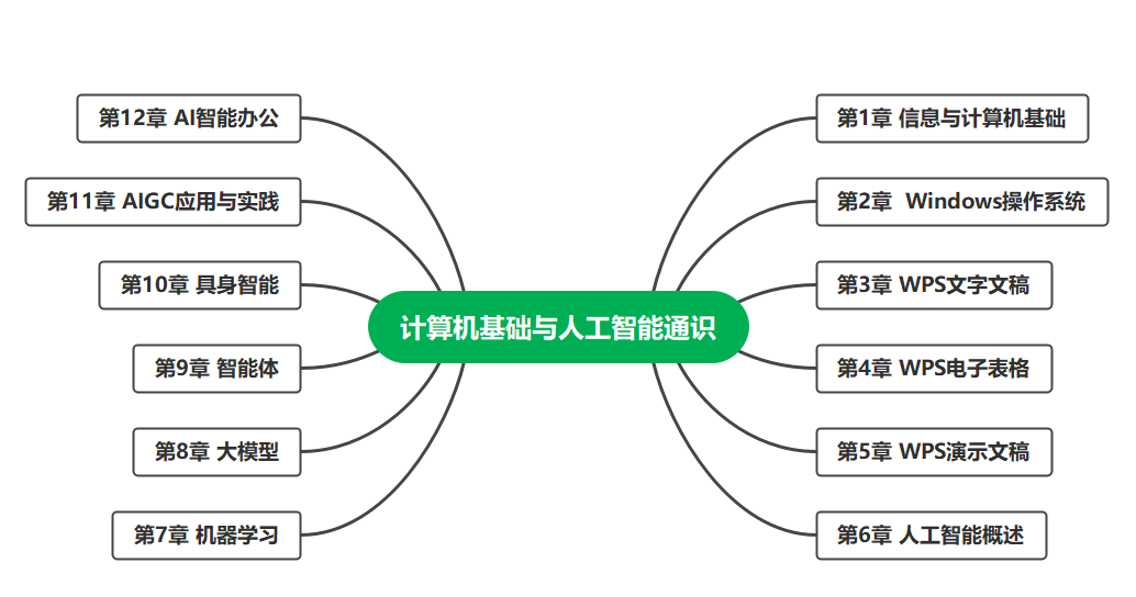 本书是面向高校大一新生的通识类教材,核心目标是帮助新生夯实计算机操作基础、普及人工智能通识知识,培养具备基本数字技能与AI素养的综合型人才,适配各专业新生的入门学习需求,为后续专业学习和终身发展筑牢数字根基。全书整体分为两大篇章,共12章,结构清晰、循序渐进,兼顾基础性、实用性与前沿性,摒弃深奥理论堆砌,以通俗语言结合实用场景展开讲解。第一篇为计算机基础篇(第1-5章),围绕Windows 10操作系统与WPS办公套件,系统讲解信息与计算机基础、操作系统实操、WPS文字文稿编辑、电子表格处理及演示文稿制作的核心技能。第二篇为人工智能通识篇(第6-12章),从人工智能概述入手,逐步讲解机器学习、大模型、智能体、具身智能等核心概念,延伸至AIGC应用与实践、AI智能办公技巧,引导学生了解AI技术的发展现状与应用边界,培养学生运用AI工具提升学习和工作效率的思维。